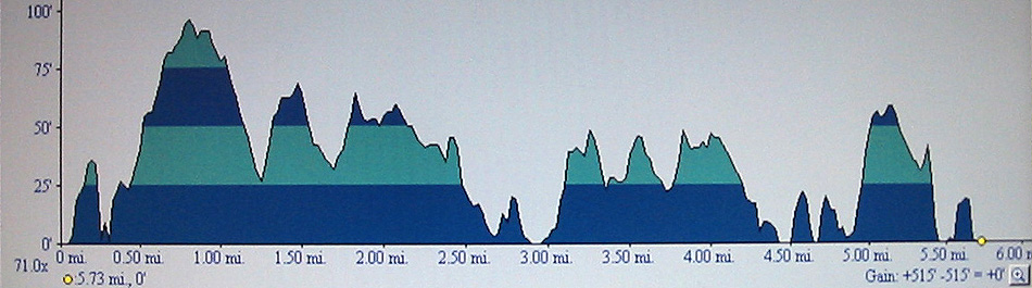 A great 11AM run today in the Thirty-Fourth Annual Seagull Six down in the Woods Hole section of Falmouth. The race is a 5.74 mile course and is sponsored by the Falmouth Track Club. The race brings you through a rather hilly course through great residential neighborhoods and along the Atlantic Ocean. To call the course “hilly” is probably actually an understatement since for most of the race you are climbing up and down rolling hills and mile one is basically an uphill run the entire way. Here’s the elevation breakdown of the course.